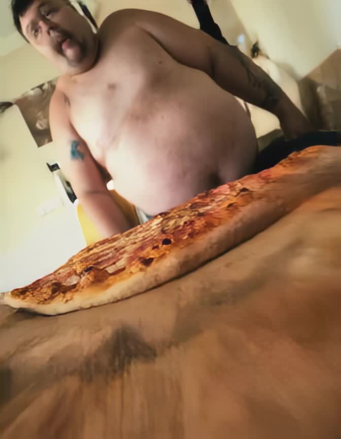 An Obese man sniffs a pizza.