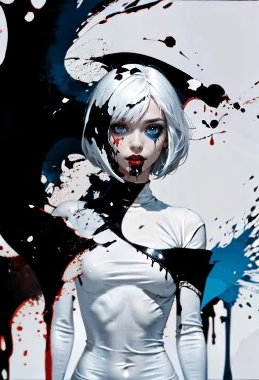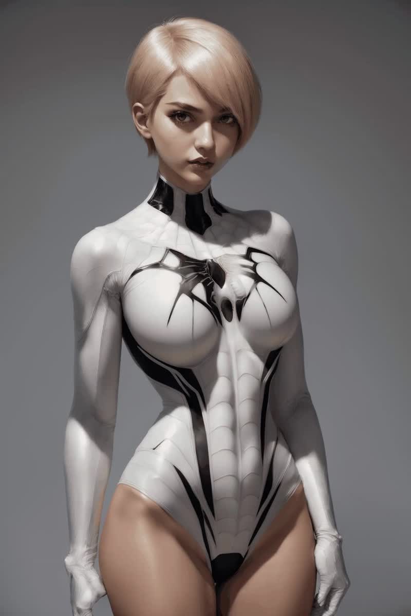beautiful girl, white and black spider man suit, short blunt…